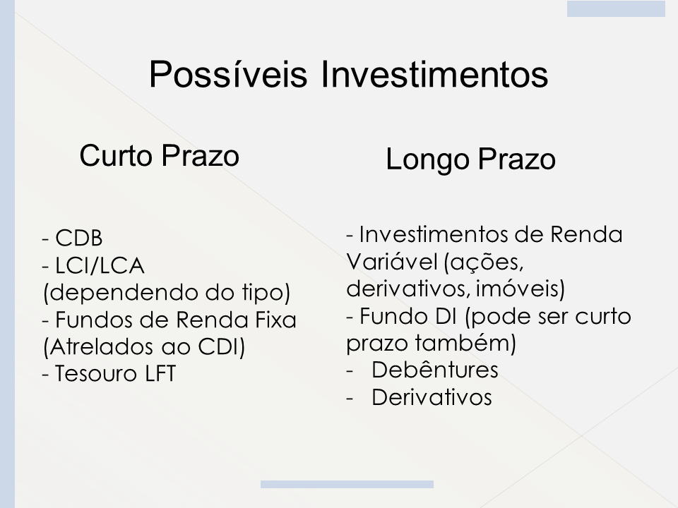 Na tabela abaixo alguns exemplos de aplicações que melhor se encaixam em curto e longo prazo. Lembrando que em alguns casos a aplicação serve tanto para curto como longo.