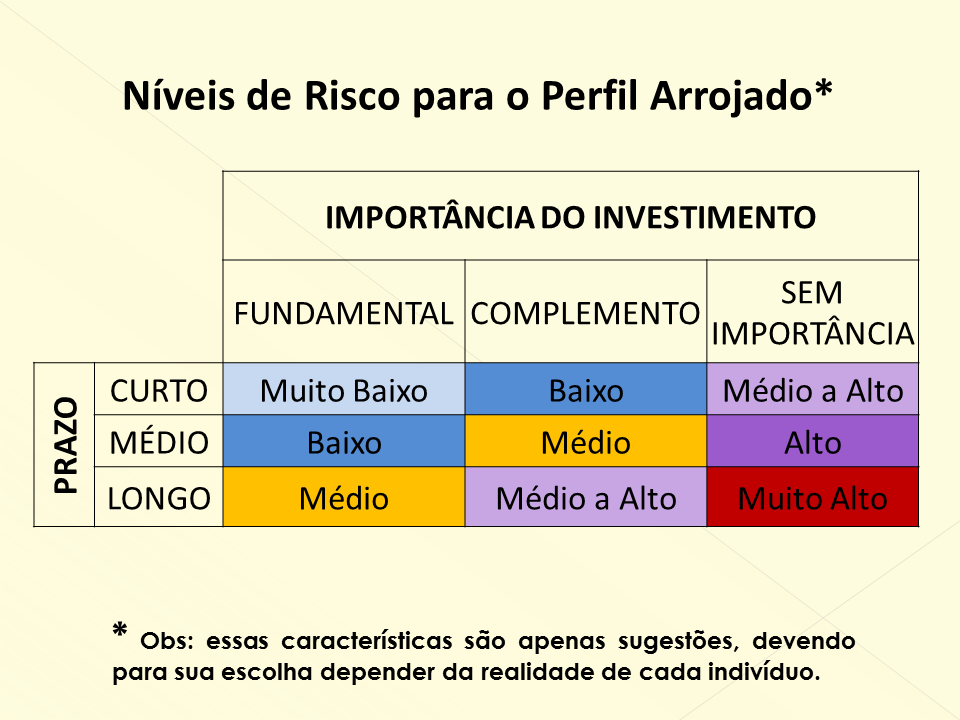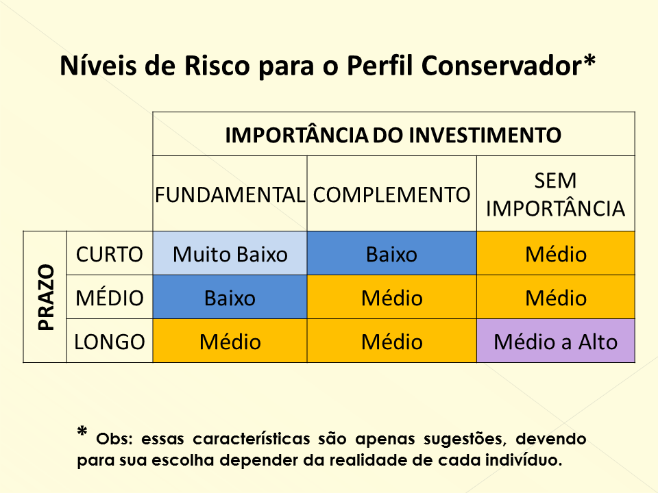 Cada tabela sugere* para cada tipo de perfil do investidor quais os graus de risco dos investimentos ele pode se basear levando em consideração a importância e o prazo. Basta então escolher os investimentos que se encaixam no cruzamento destas variantes.