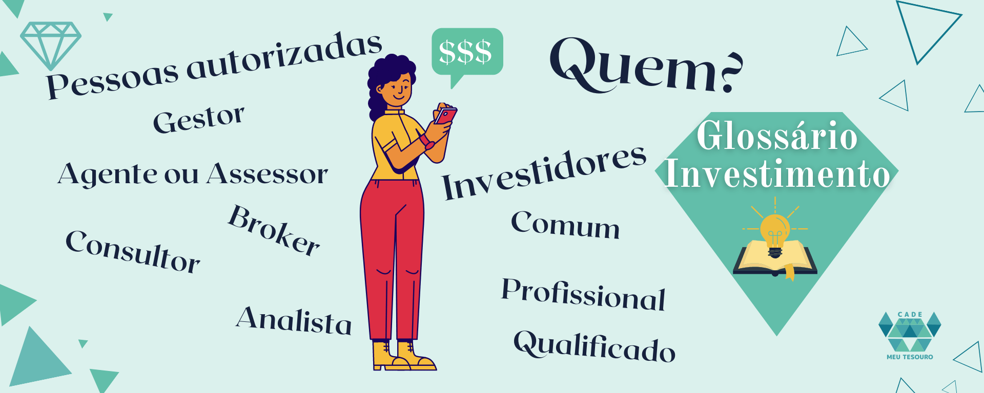 Neste último glossário de investimentos vamos falar das pessoas que atuam neste mercado. Podemos dividir em duas partes. A primeira são as pessoas que trabalham e precisam estar autorizadas para isso. O outro grupo são as pessoas que colocam o dinheiro para investir.